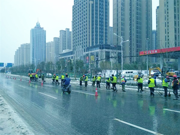 和楊彪一樣,項(xiàng)目經(jīng)理張西林在率隊(duì)來到楊泗港快速通道之前,已經(jīng)在漢陽大道奮戰(zhàn)了整整一天。他的隊(duì)伍遍布在鐘家村、江城大道以及楊泗港快速通道上,要同時兼顧到三個地方的除雪作業(yè),他的手機(jī)一直處于通話狀態(tài),在指揮現(xiàn)場隊(duì)伍進(jìn)行除雪作業(yè)的間隙,也悄然完成了幾處除雪點(diǎn)之間的人員與機(jī)械調(diào)度。作為連接四新地區(qū)與武昌、白沙洲地區(qū)的交通要道,楊泗港快速通道四新段受極端雨雪天氣影響已于25日臨時封閉,截至發(fā)稿,張西林和他的除雪隊(duì)伍仍在江城大道立交進(jìn)行緊張的除雪作業(yè),力爭盡快清理道路,早日打開雨雪天氣對快速通道的封閉。