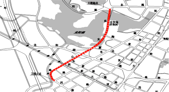 該工程位于武漢市二環(huán)、三環(huán)之間,全長約3026.226米,含有兩座跨龍陽湖高架,康達(dá)街至朱家新港路段為“高架+地面輔道”形式,其他路段為地面道路形式。漢陽市政天創(chuàng)公司負(fù)責(zé)實施的部分包括全長485.5米、以高架形式跨越龍陽湖的1號橋、Y/Z匝道以及長約185米的地面道路施工。
