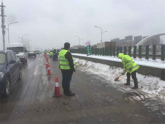16時(shí)40分,墨水湖大橋橋面積雪全部清理完畢;