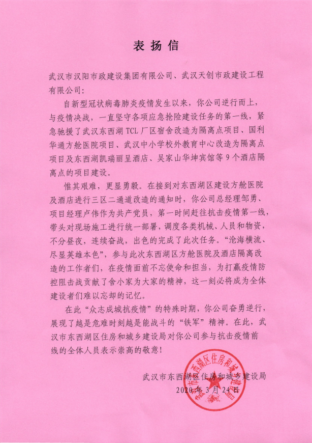 3月24日、3月25日,漢陽市政天創(chuàng)公司收到了來自武漢市東西湖區(qū)住房和城鄉(xiāng)建設(shè)的表揚(yáng)信和來自武漢臨空港經(jīng)濟(jì)技術(shù)開發(fā)區(qū)城市建設(shè)發(fā)展投資集團(tuán)有限公司的感謝信,信中對漢陽市政天創(chuàng)公司參與防疫建設(shè)工程的全體人員表示崇高的敬意!