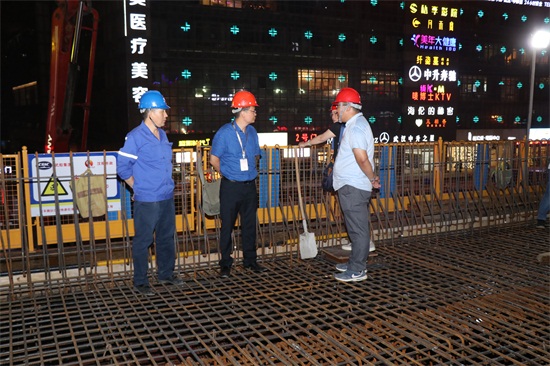 5月27日晚9:00,解放大道第六聯(lián)箱梁順利開(kāi)始澆筑,于原計(jì)劃6月8日澆筑整整提前了13天。解放大道第六聯(lián)箱梁全長(zhǎng)116m,需一次性澆筑混凝土1700多方,項(xiàng)目部在澆筑現(xiàn)場(chǎng)布置了2臺(tái)43m的汽車泵,計(jì)劃澆筑30小時(shí)。澆筑當(dāng)晚,漢陽(yáng)市政集團(tuán)二公司領(lǐng)導(dǎo)班子、武船集團(tuán)領(lǐng)導(dǎo)、甲方代表以及監(jiān)理公司負(fù)責(zé)人都來(lái)到了施工現(xiàn)場(chǎng),極大地鼓舞了施工人員的士氣,現(xiàn)場(chǎng)人影攢動(dòng)、引擎轟鳴,呈現(xiàn)出一派繁忙景象。在全體成員的通力合作下,于原計(jì)劃提前了3小時(shí),在28日晚12點(diǎn)圓滿完成了首聯(lián)預(yù)應(yīng)力箱梁的連續(xù)澆筑任務(wù)。