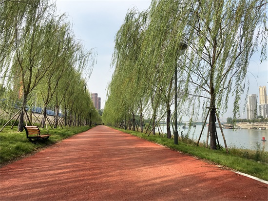 該工程近4千米長的綠道均采用彩色瀝青混凝土進行攤鋪,這種新型瀝青材料兼具良好的路用性能、消聲功能和柔韌性。在進行瀝青攤鋪施工前,項目部積極邀請專家前往現(xiàn)場對瀝青拌合和試驗段攤鋪進行了指導,統(tǒng)計出最佳技術(shù)指標并形成了作業(yè)指導書,對瀝青攤鋪作業(yè)進行了嚴格把控,并以此為切入點開展了QC研發(fā)工作,QC成果“提高彩色混凝土施工質(zhì)量”榮獲全國一等獎。