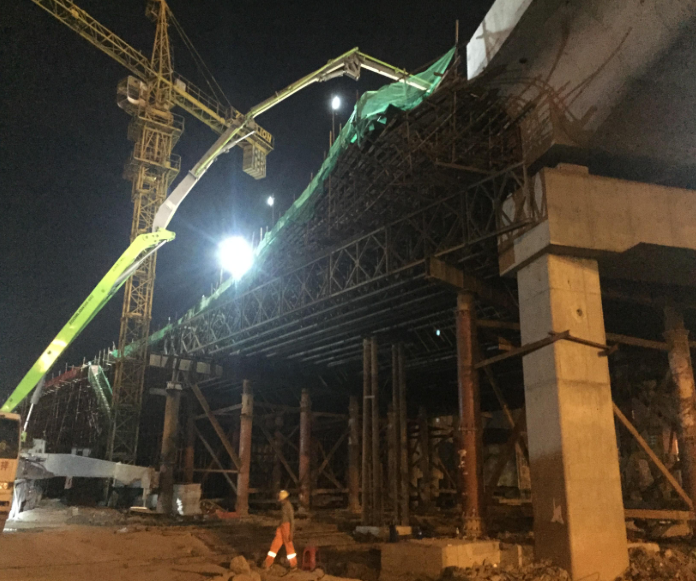 向陽東路(江堤中路-鸚鵡大道)西起江堤中路,東至鸚鵡大道,路線全長1172.9m,寬30-40m。其地理位置特殊,跨越江堤路、國博大道、楊泗港,火車、機(jī)動車川流不息。項目安全風(fēng)險極大,一旦發(fā)生支架垮塌事故,后果將不堪設(shè)想。項目部高度重視質(zhì)量安全問題,結(jié)合工程實際,強(qiáng)化對質(zhì)量計劃、技術(shù)交底、驗收規(guī)范等制度或規(guī)定的學(xué)習(xí),使項目管理人員、施工隊管理人員及工人增強(qiáng)了質(zhì)量安全意識,保證了工程項目如期完工。