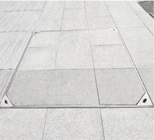 現(xiàn)場全線更換新型隱形井蓋,采用5mm厚不銹鋼檢查井與人行道路面銜接平順、井座完整、無松動、無沉陷、井蓋承載力復(fù)合設(shè)計規(guī)范要求。