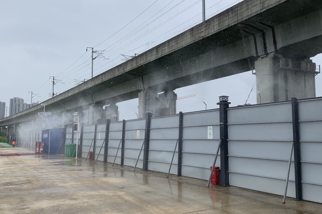 進(jìn)入施工區(qū),項(xiàng)目封閉墻上,隨處可見安全文明標(biāo)志牌和提示語。施工區(qū)自動(dòng)噴淋降塵系統(tǒng)不時(shí)觸發(fā),楊碧華饒有興趣地聽取了解。在浦興路施工場區(qū),揚(yáng)塵監(jiān)控系統(tǒng)可以有效監(jiān)測現(xiàn)場溫度、濕度、風(fēng)速、PM10濃度和PM2.5濃度,“現(xiàn)場揚(yáng)塵較大時(shí),系統(tǒng)自動(dòng)開啟運(yùn)行,保證揚(yáng)塵控制在合理范圍內(nèi)。”現(xiàn)場項(xiàng)目負(fù)責(zé)人介紹到。