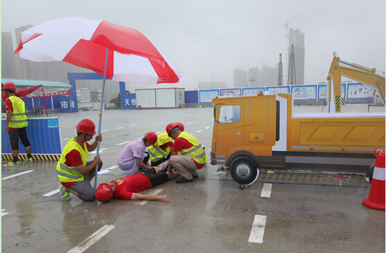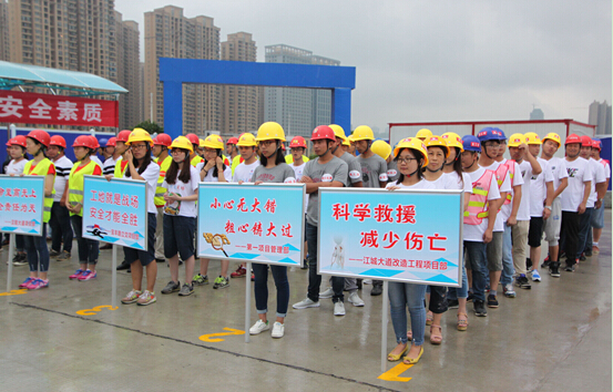 6月19日上午9點(diǎn),天創(chuàng)市政2016年安全應(yīng)急救援演練活動(dòng)在江城大道改造工程項(xiàng)目部冒著暴雨如期舉行,6支參賽隊(duì)分別以項(xiàng)目經(jīng)理、一線人員及民工組隊(duì)構(gòu)成,共計(jì)87人參加了此次演練。漢陽(yáng)市政及建元等公司領(lǐng)導(dǎo)到場(chǎng)觀演。