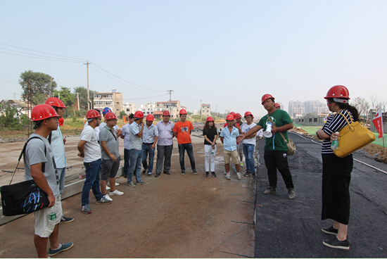 培訓(xùn)過(guò)程中,快活嶺路項(xiàng)目技術(shù)負(fù)責(zé)人首先帶領(lǐng)大家參觀了混凝土路面的施工現(xiàn)場(chǎng),詳細(xì)介紹了混凝土路面的施工流程、工藝及設(shè)備的配置與作用;肖三秀、范濤對(duì)模板架設(shè)等相關(guān)知識(shí)進(jìn)行了細(xì)致地講解。隨后,全體人員通過(guò)詳實(shí)的PPT課件系統(tǒng)地學(xué)習(xí)了混凝土路面的施工工序及精細(xì)化施工要點(diǎn)。