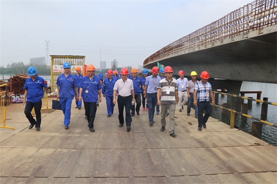 隨后楊志鋼率隊來到墨水湖北路工程施工現(xiàn)場,一行人以第3聯(lián)鋼箱梁為起點,經(jīng)龍陽湖上施工棧橋到達項目部,對該工程一工區(qū)施工情況進行了細(xì)致地巡查,嚴(yán)悌文、程強與楊志鋼一行在巡查過程中進行了深入交談。楊志鋼就漢陽市政集團公司取得雙特級資質(zhì)表示祝賀,對漢陽市政銳意進取、力爭上游的精神給予了肯定。嚴(yán)悌文表示,取得雙特級資質(zhì)標(biāo)志著企業(yè)綜合實力的進一步提升,漢陽市政將與武船集團通力協(xié)作,保質(zhì)保量地完成好這兩項重點工程。( 張遼 文/圖)