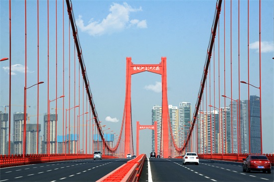 鸚鵡洲長江大橋正橋工程于2010年8月正式開工建設,歷時4年4個月,于2014年12月28日正式建成通車。橋梁全長3.42公里,其中主橋2.1公里,漢陽岸引橋595米,武昌岸引橋725米。橋梁建設采用三塔懸索橋結構形式,雙向8車道,設計時速60公里/小時,是目前世界在建同類橋梁中跨度最大的三塔四跨懸索橋。作為武漢市第8座長江大橋,鸚鵡洲長江大橋以紅色為主色調,串聯(lián)起武昌、漢陽兩鎮(zhèn),已成為武漢一大具有地標性的建筑。