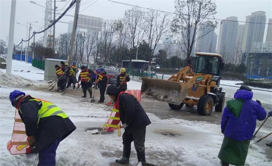 指令一發(fā),天創(chuàng)市政立即上下聯(lián)動,冒著嚴寒調(diào)度人員和機械設(shè)備,共計投入人員500余人,鏟車10臺,農(nóng)用車20輛,工業(yè)鹽10噸,防滑墊20000平方,短短3個小時,除雪道路長度超9千米。與此同時,公司分布在武昌、漢口、東西湖及漢陽等地的30余處在建項目也在全力清掃工地及沿路周邊的積雪,確保市民安全通行。
