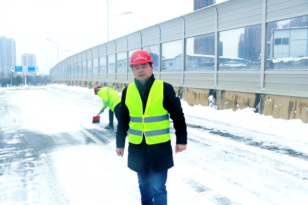 27日上午,來自向陽東路項(xiàng)目的施工員馮凌杰在參加完武漢市首屆職工春晚節(jié)目《幸福工程》情景劇的彩排后,第一時間趕到了除雪一線,全身心的投入到江城大道的除雪工作中。指揮作業(yè)、分導(dǎo)車流、引導(dǎo)機(jī)械,寒風(fēng)中,他額頭居然滲出汗來。“這條雙向六車道的路還有三公里的積雪要清除,早點(diǎn)清理完市民們出行就方便很多?!彼f話的間隙路上駛過一輛公交車,乘客們臉上露出的欣喜和微笑大概就是給這支除雪隊(duì)伍最好的褒獎。