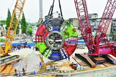 下午1點,準(zhǔn)備工作完成,正式開始吊裝,兩臺吊車通過數(shù)根直徑120毫米的鋼纜繩吊起刀盤;2點35分,水平狀的刀盤開始“翻身”,直立起來;完全直立后,松掉400噸吊車上的鋼纜,僅用750噸吊車將它吊起,垂直于地面,再往44米深的盾構(gòu)始發(fā)井里吊裝。