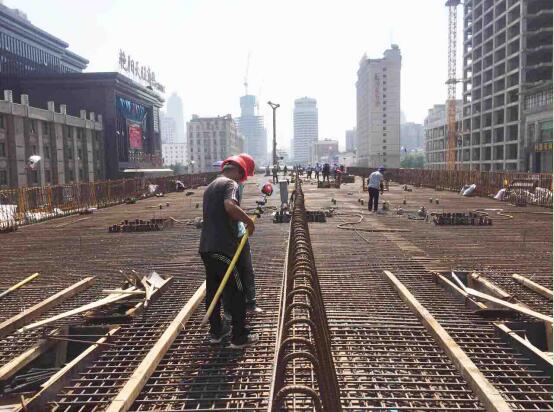 該工程北起建設(shè)大道,南止京漢大道,接寶豐北路高架橋后以高架形式與江漢四橋(月湖橋)北岸引橋連接,主線高架橋全長(zhǎng)1448米,于解放大道路口設(shè)置一座四層互通式寶豐路立交。其中,解放大道是一條縱貫漢口市區(qū)的大道,也是武漢市區(qū)最長(zhǎng)、最繁華的一條主干道。川流不息的車輛、熙熙攘攘的人群、縱橫交錯(cuò)的各類管線、分布密集的居民區(qū)和商業(yè)區(qū)都為現(xiàn)場(chǎng)施工帶來了巨大挑戰(zhàn)。自開工至今,該工程項(xiàng)目團(tuán)隊(duì)頂住各方壓力,克服重重困難,堅(jiān)持日夜奮戰(zhàn),加快施工進(jìn)度,連續(xù)完成了模板安裝、鋼筋綁扎、預(yù)應(yīng)力管道、鋼絞線穿束等關(guān)鍵工序的施工,成功為首聯(lián)箱梁的澆筑工作奠定了基礎(chǔ)。
