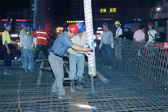 5月27日晚9:00,解放大道第六聯(lián)箱梁順利開(kāi)始澆筑,于原計(jì)劃6月8日澆筑整整提前了13天。解放大道第六聯(lián)箱梁全長(zhǎng)116m,需一次性澆筑混凝土1700多方,項(xiàng)目部在澆筑現(xiàn)場(chǎng)布置了2臺(tái)43m的汽車泵,計(jì)劃澆筑30小時(shí)。澆筑當(dāng)晚,漢陽(yáng)市政集團(tuán)二公司領(lǐng)導(dǎo)班子、武船集團(tuán)領(lǐng)導(dǎo)、甲方代表以及監(jiān)理公司負(fù)責(zé)人都來(lái)到了施工現(xiàn)場(chǎng),極大地鼓舞了施工人員的士氣,現(xiàn)場(chǎng)人影攢動(dòng)、引擎轟鳴,呈現(xiàn)出一派繁忙景象。在全體成員的通力合作下,于原計(jì)劃提前了3小時(shí),在28日晚12點(diǎn)圓滿完成了首聯(lián)預(yù)應(yīng)力箱梁的連續(xù)澆筑任務(wù)。