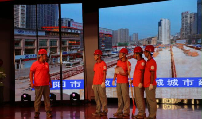 該情景劇由發(fā)生在天創(chuàng)市政李程身上的真實故事改編而成,講述了李程在擔(dān)任寶豐路硚口路(建設(shè)大道-京漢大道)改造工程項目經(jīng)理期間,為搶抓工期,將家搬到項目部的感人事跡。舞臺上,來自天創(chuàng)市政的14名員工,通過舞蹈、表演、音樂等藝術(shù)形式,配合現(xiàn)場舞美與恢弘的背景視頻,將李程與妻子相戀結(jié)婚、項目團(tuán)隊冒雨防汛、李程攜手妻子與市政兄弟共建大武漢等情景演繹得淋漓盡致,完美展現(xiàn)了天創(chuàng)市政“鐵軍”在市政建設(shè)中奮勇?lián)?dāng)與無私奉獻(xiàn)的精神。