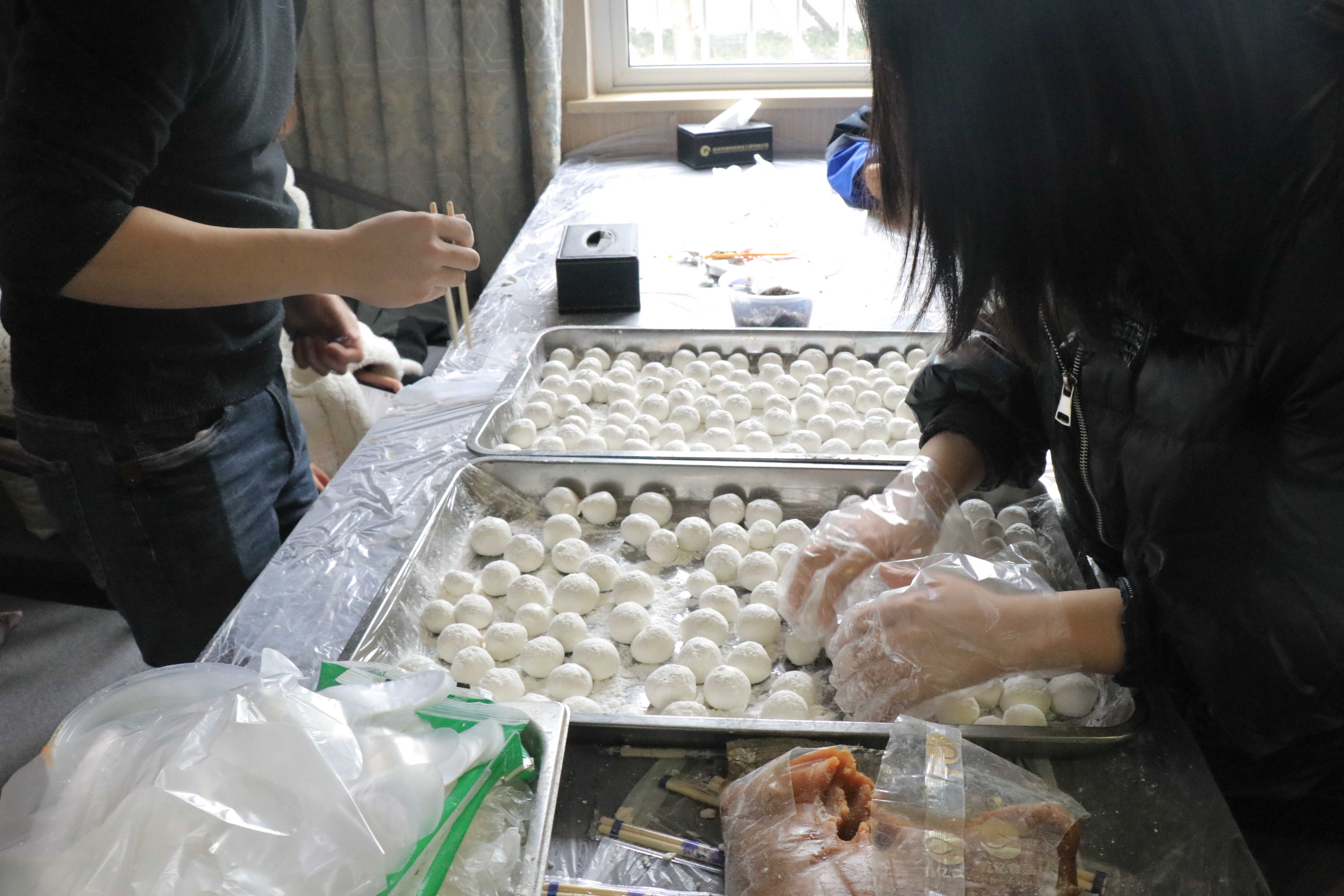 在包元宵比賽前,廚房師傅李威做現(xiàn)場(chǎng)教學(xué)指導(dǎo),大家認(rèn)真學(xué)習(xí)包元宵的步驟和注意事項(xiàng)。和糯米粉時(shí)水要適量,糯米皮兒的大小要適中,揉出的元宵形狀要美觀……師傅領(lǐng)進(jìn)門,包元宵還要看個(gè)人!每個(gè)小組都做好了分工,有和面的、包餡的、加水的……好不熱鬧。在大家的通力合作下,事先準(zhǔn)備好的板栗、香芋、黑芝麻等七種餡料,被使用不少。