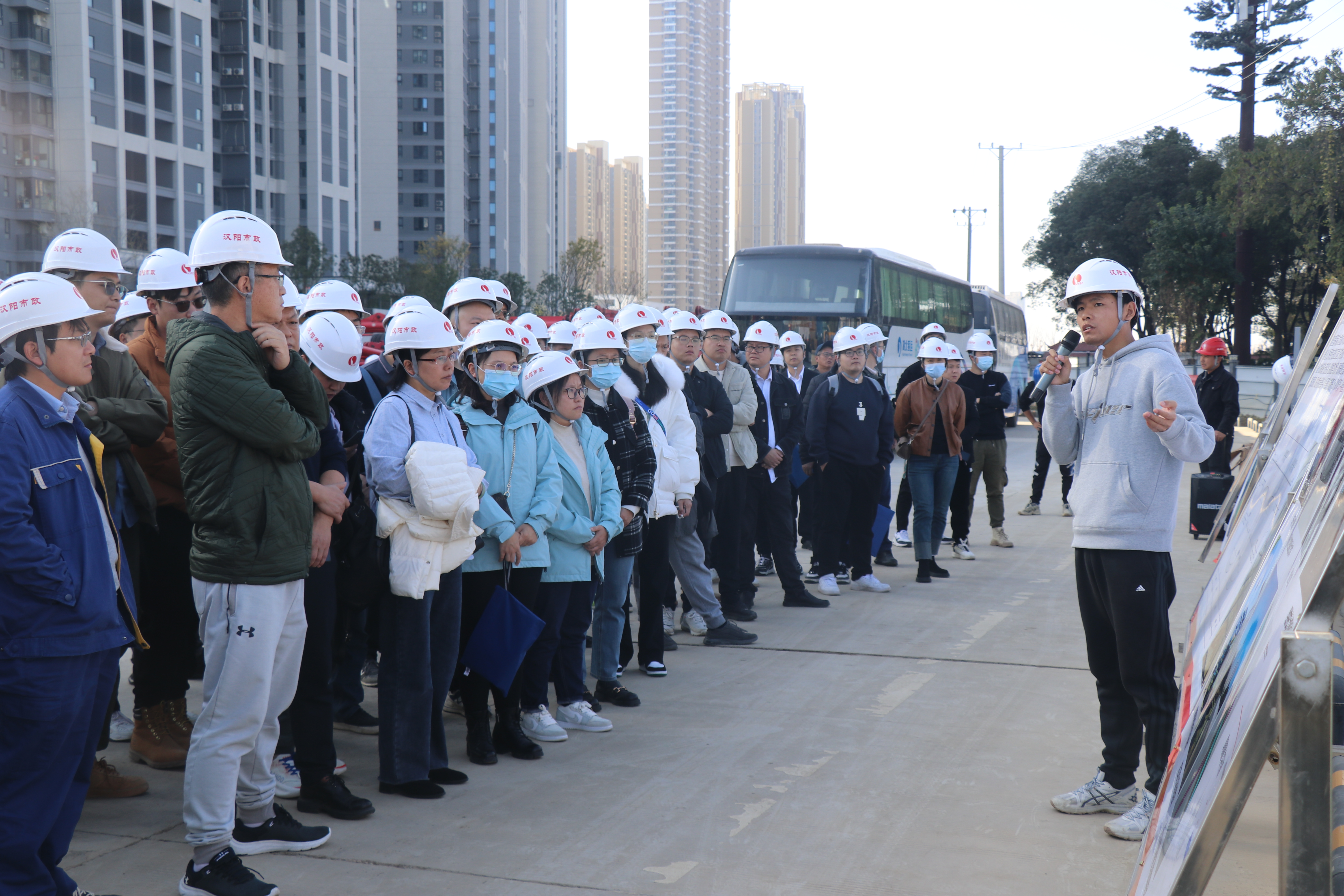 跟隨項目技術(shù)負(fù)責(zé)人胡志宏的講解,觀摩人員有序參觀了漢江南岸下穿通道、知音大道(蟠龍路-金龍路)段等點位,與現(xiàn)場技術(shù)人員展開了熱烈交流,對漢江南岸項目的綠色管理、質(zhì)安亮點、精細(xì)化施工、節(jié)能創(chuàng)新等舉措給予了高度評價。